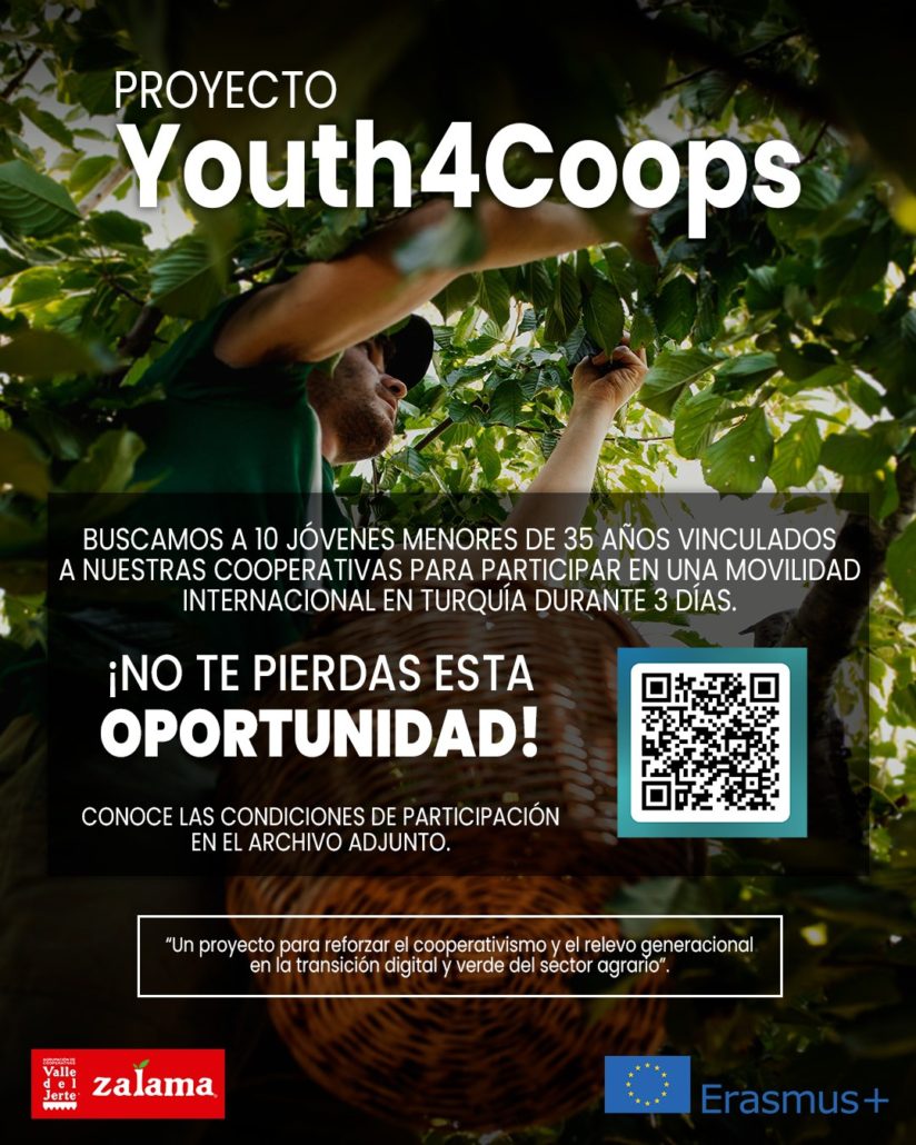Por primera vez, la Agrupación de Cooperativas Valle del Jerte (ACVJ) participa como socia en un proyecto Erasmus+, “Youth4Coops”, para reforzar el cooperativismo y el relevo generacional en la transición digital y verde del sector agrario. El proyecto se desarrolla en colaboración con Genç Isi Kooperative of Izmir (Turquía) y Haliéus (Italia).